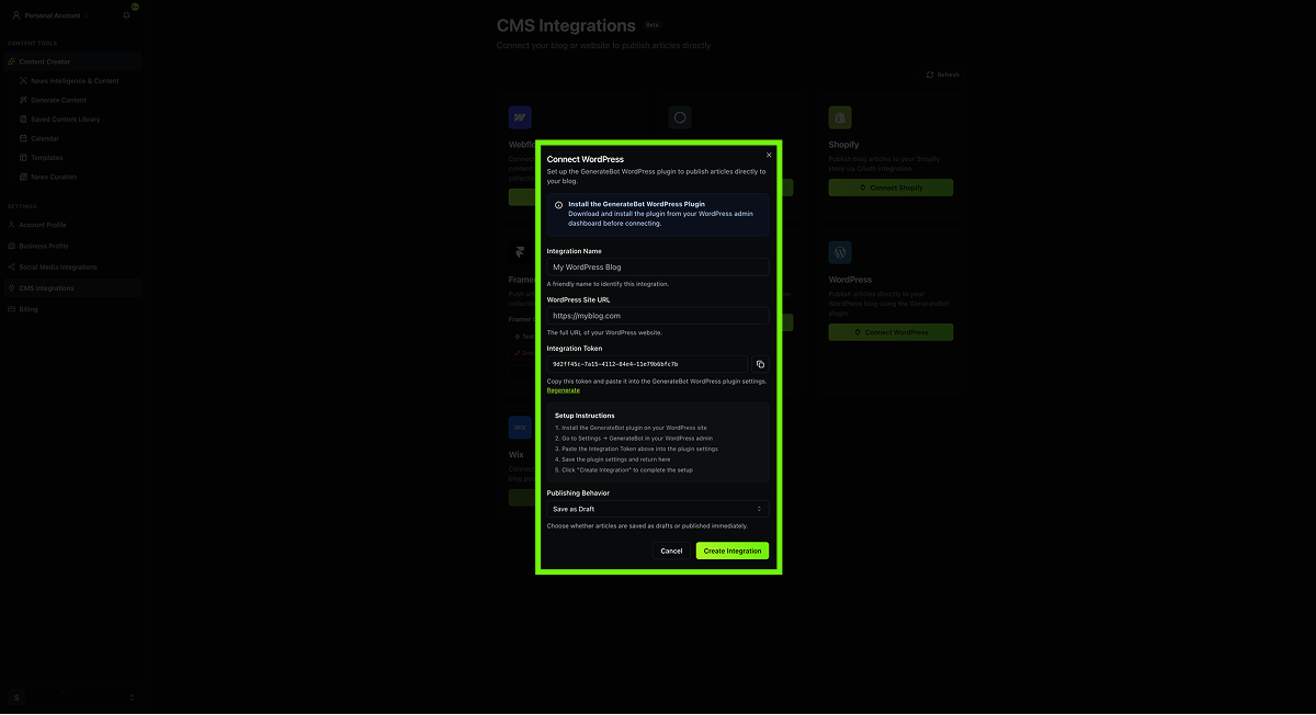Currently, the plugin supports a single integration token per site. All GenerateBot accounts that need to publish to the same site should share the same token.