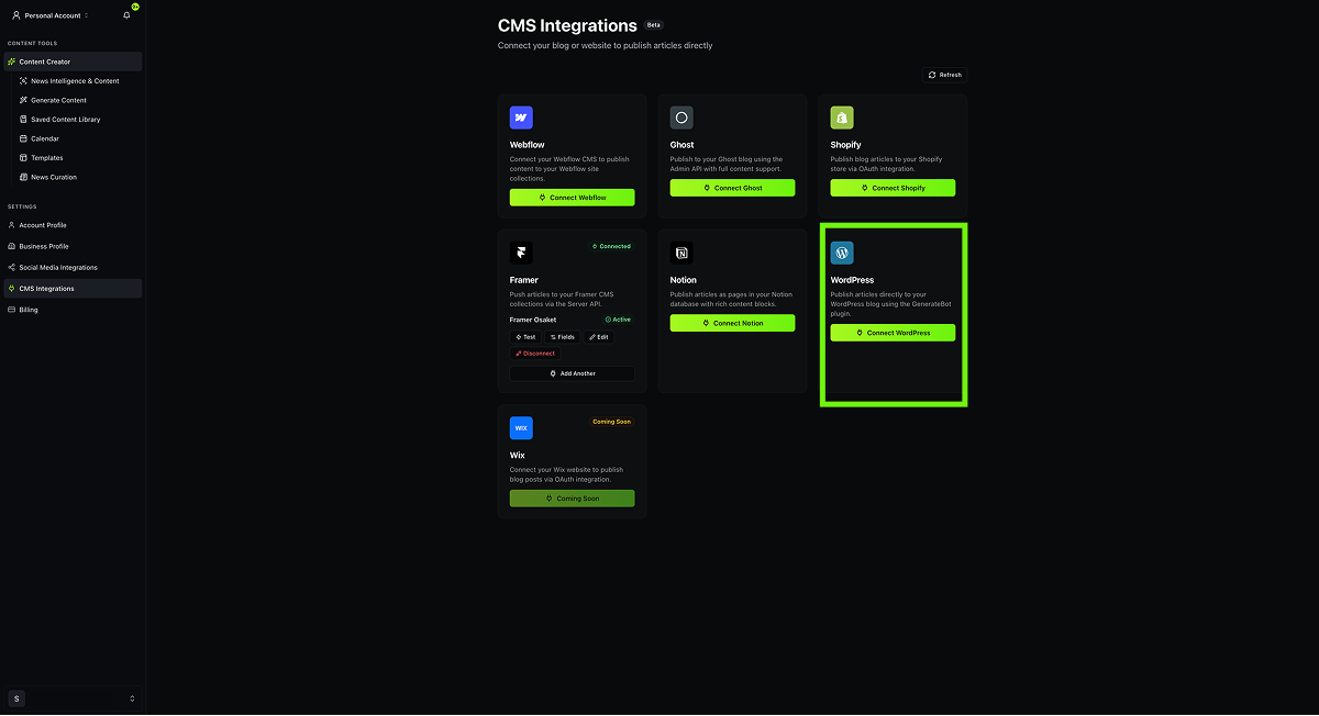 3. In your GenerateBot dashboard, go to Integrations > Connect WordPress.