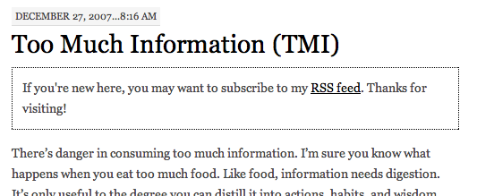 By default, new visitors to your blog will see a small box above each post containing the words « If you’re new here, you may want to subscribe to my RSS feed. Thanks for visiting! » After 5 visits the message disappears. You can customize this message, its lifespan, and its location. The message can be excluded from certain pages if desired.